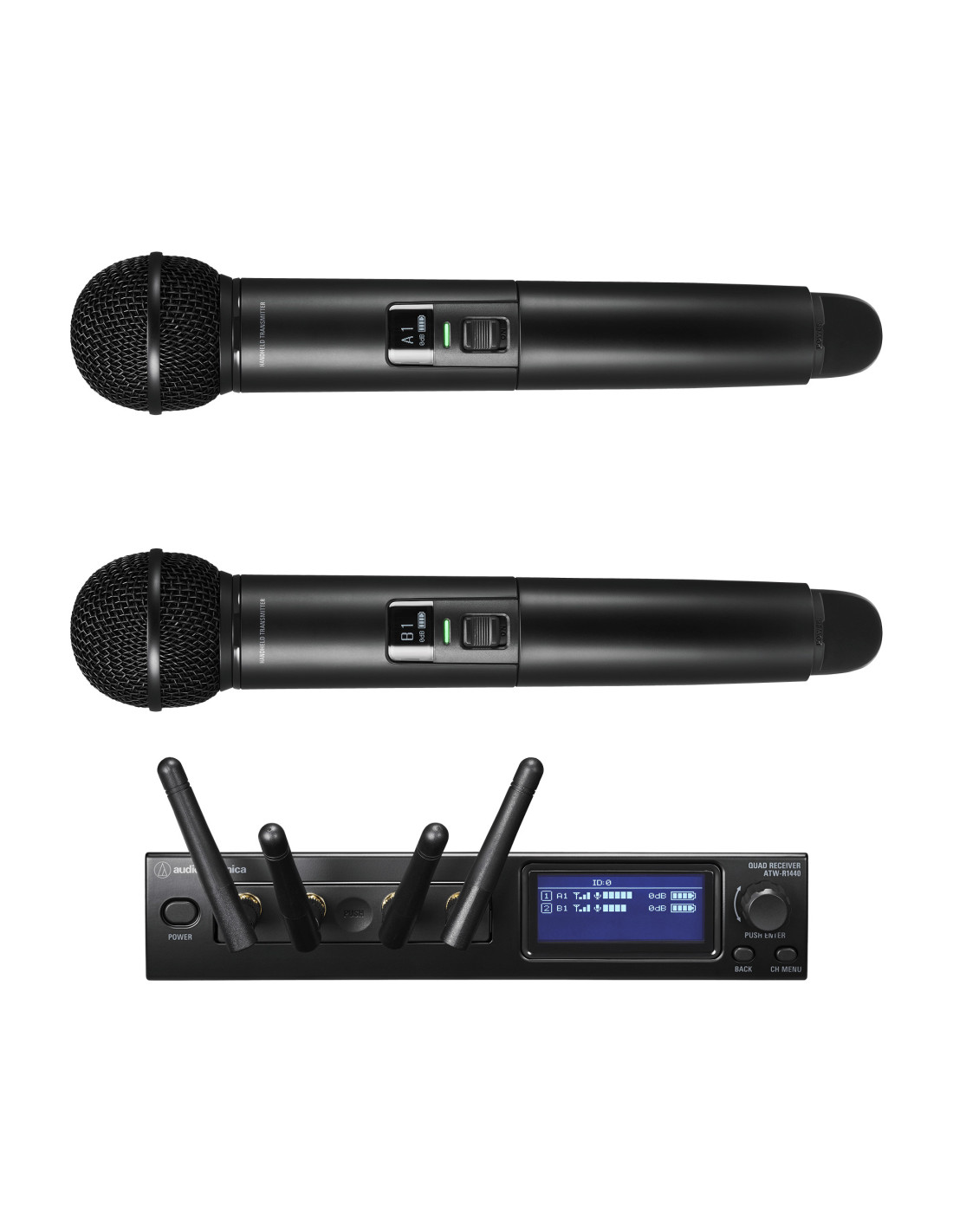 - Sistema dual profesional de mano con receptor de 4 canales y 2 transmisores ATW-T1402