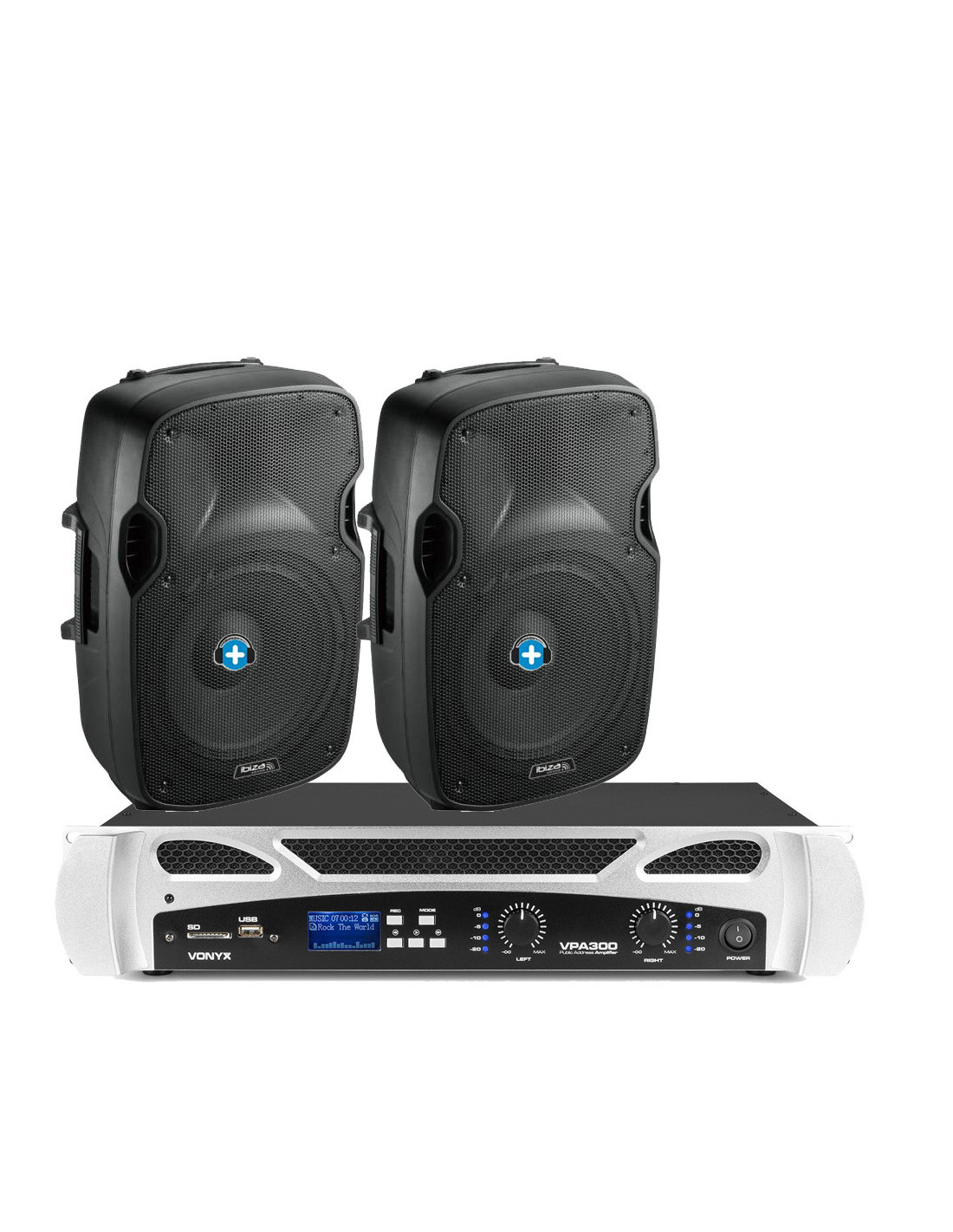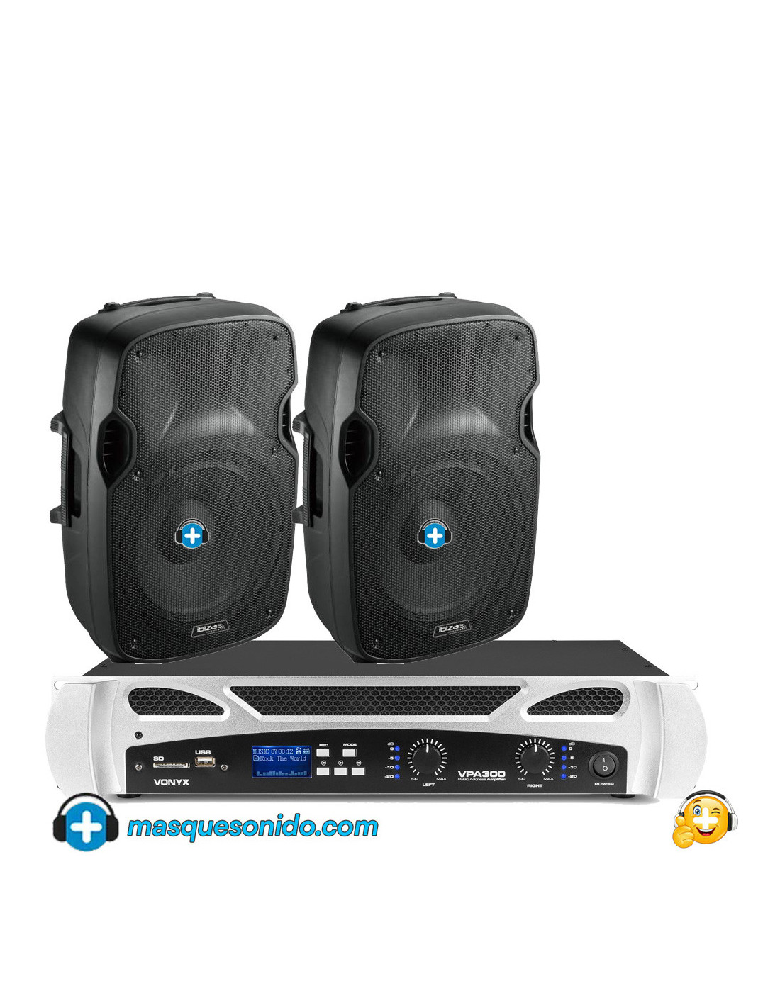 2. Amplificador PA Vonyx VPA300 El cerebro de la operación. Este amplificador no solo da potencia, sino que convierte tu equipo en un centro multimedia.