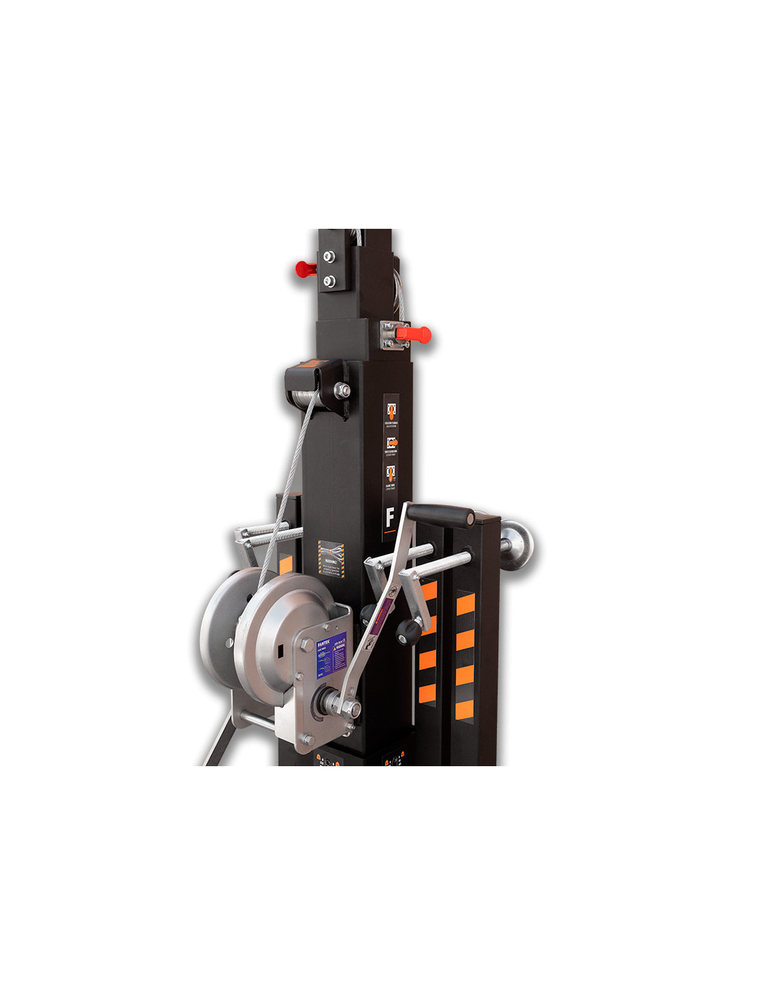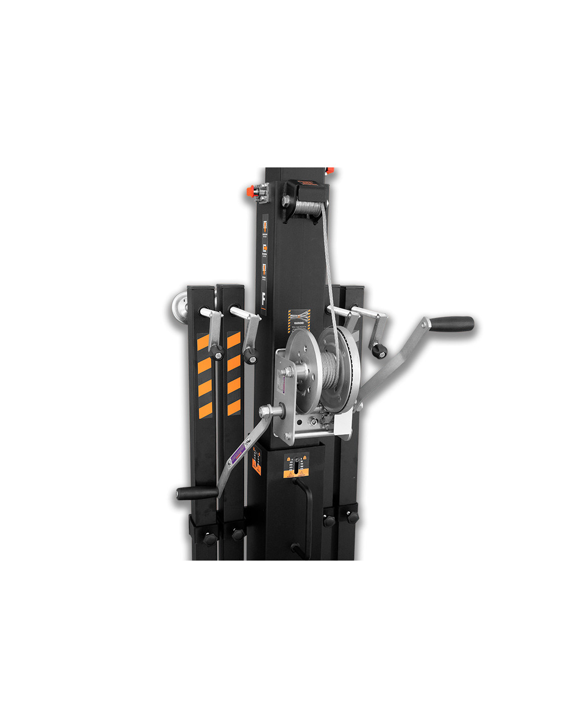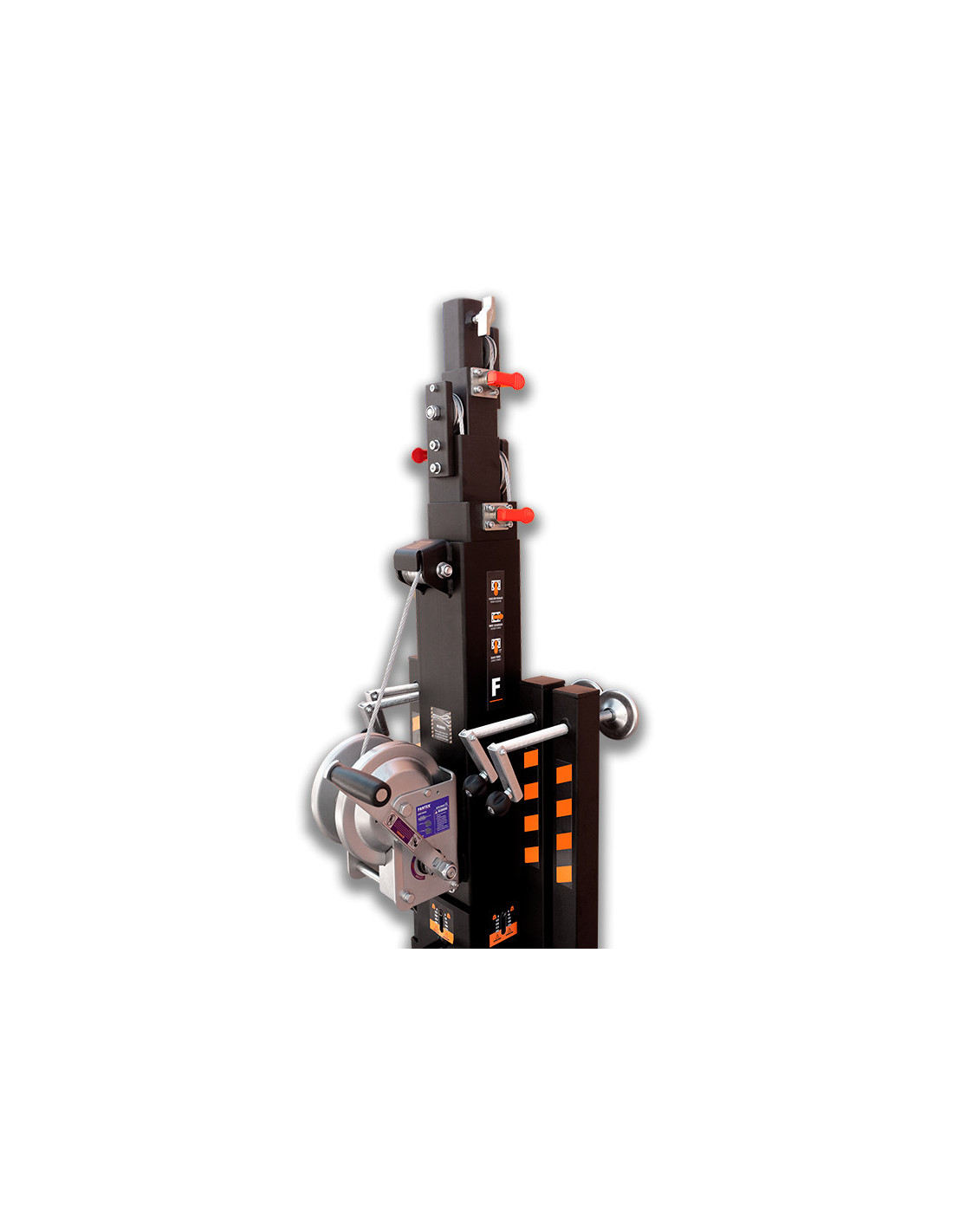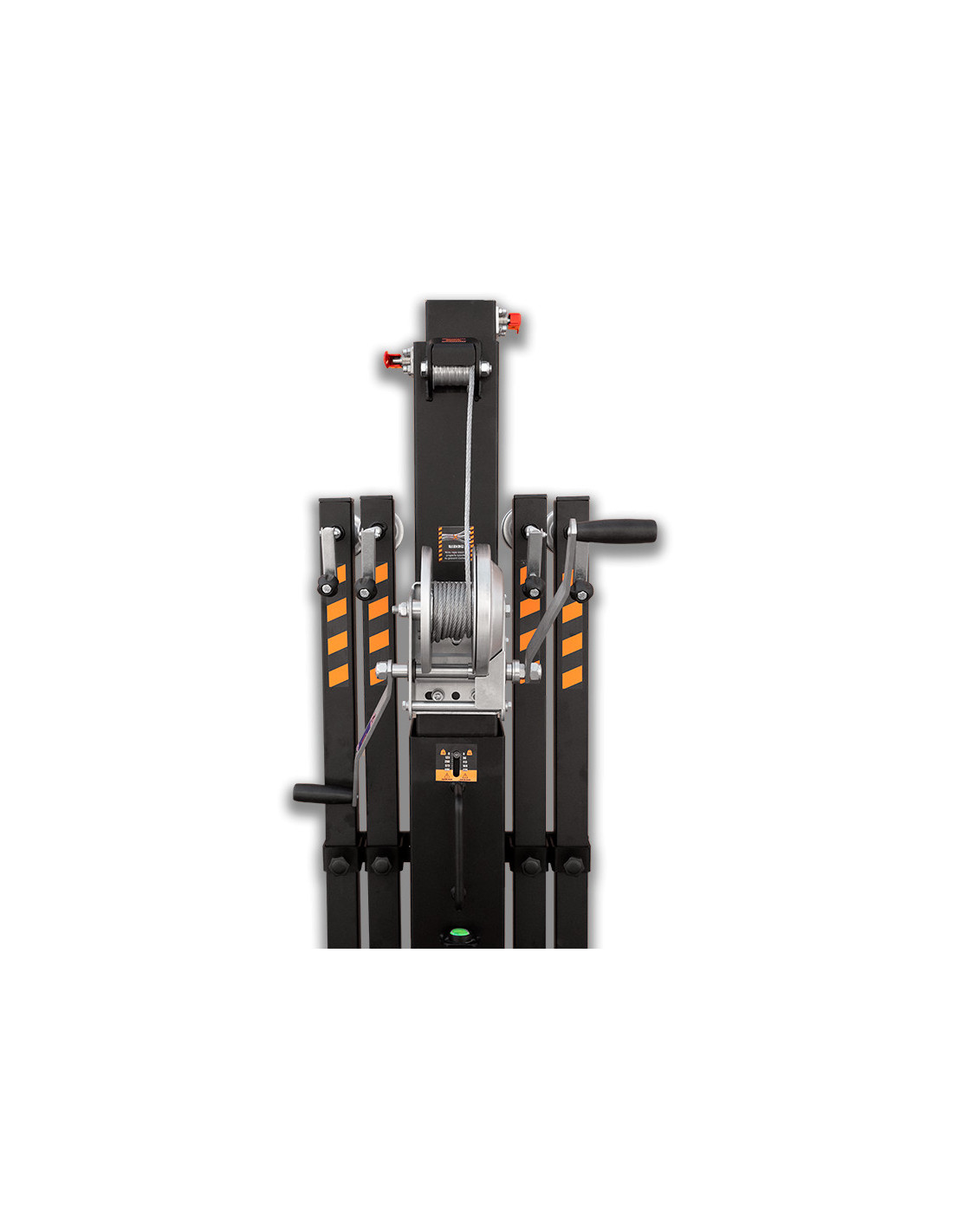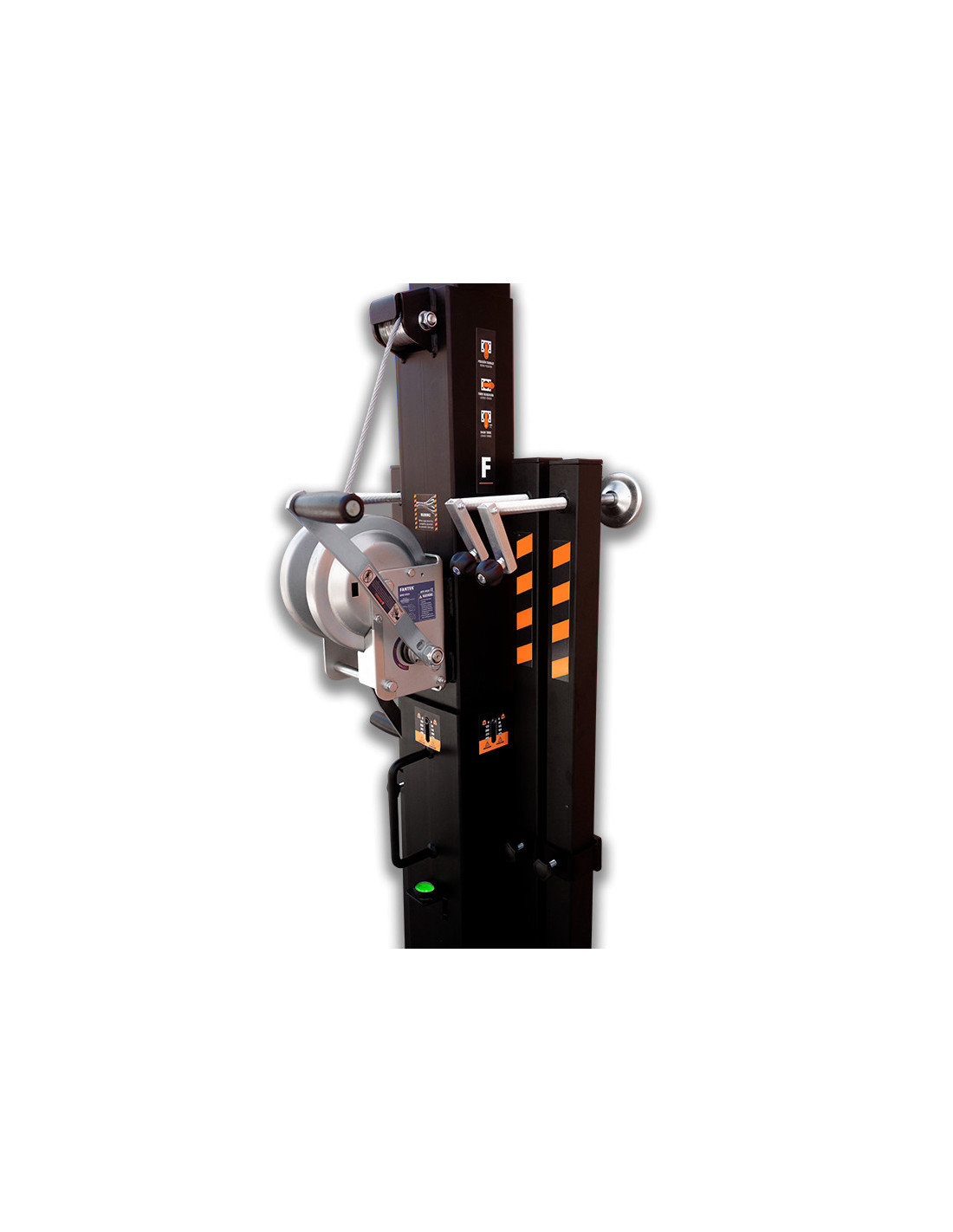 La torre elevadora telescópica modelo TK 6422 LS es una torre diseñada para levantar cargas verticales hasta 225 Kg y 6,4 metros de altura. Dispone del sistema Loadsense, que permite monitorizar la carga de la torre de acuerdo con las exigencias de la EN-17206. Compuesta por 5 perfiles de acero extensibles elevados mediante un cable de acero de alta resistencia. Fijación del tramo de la torre a la altura de trabajo con pasador de seguridad automático de acero. Patas con apoyos antideslizantes de goma. Todo el sistema se opera mediante un cabrestante de accionamiento manual con doble manivela.