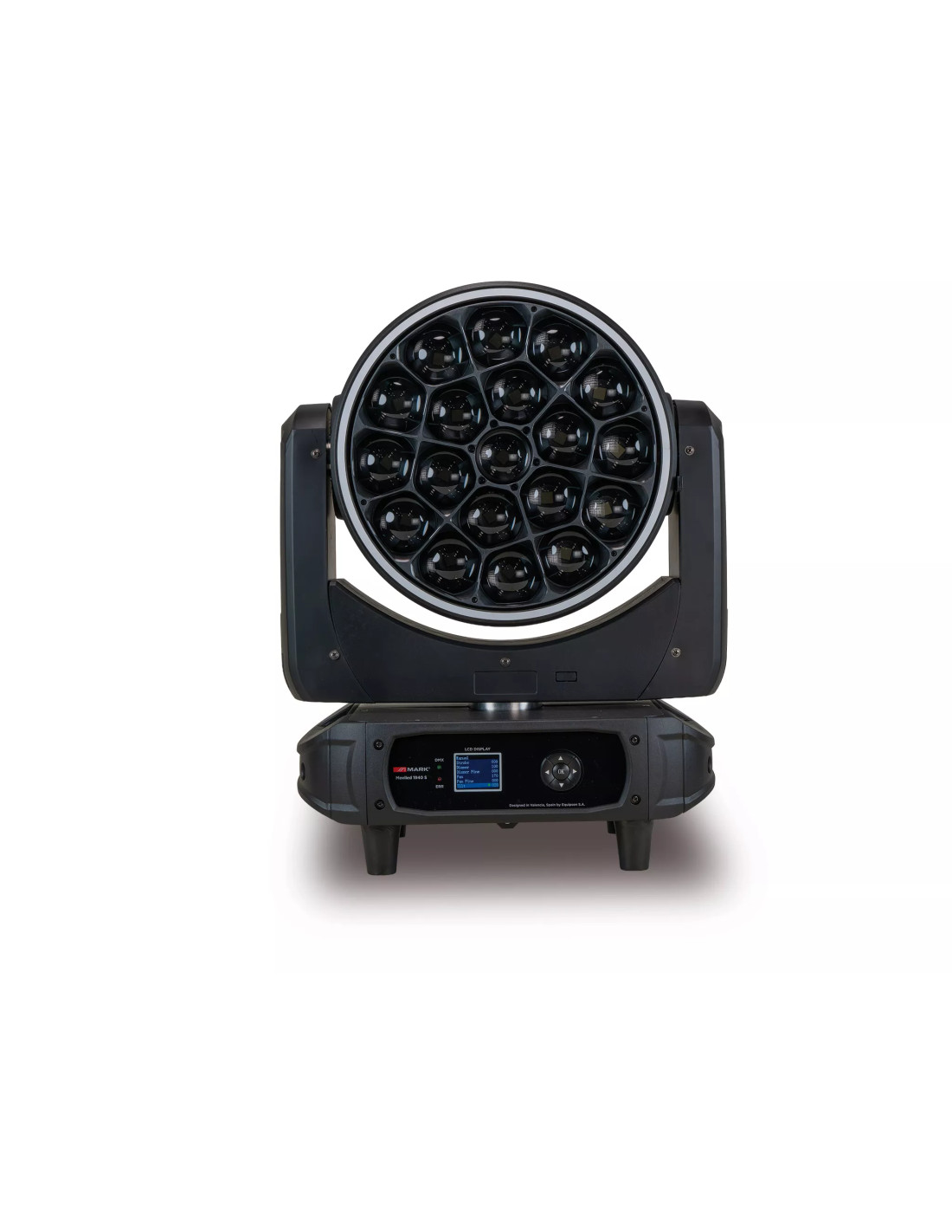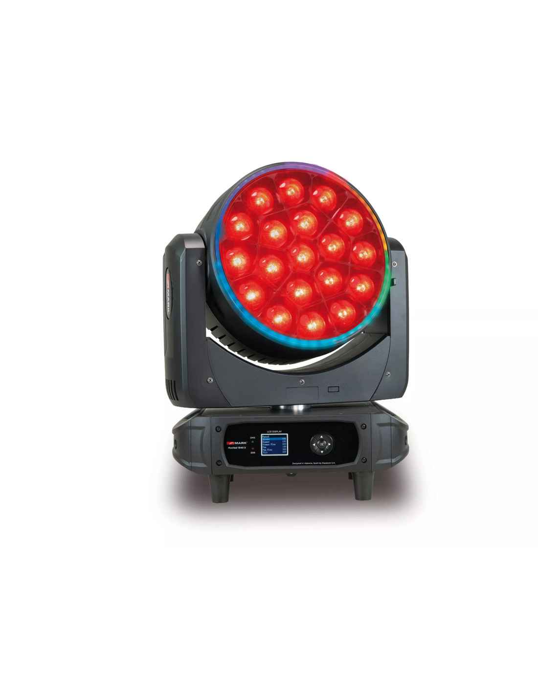 Cada unidad MOVILED 1940 S integra 19 LED RGBW 4 en 1 de 40 W, lo que permite generar una salida luminosa potente y una mezcla de color rica y uniforme. Su zoom motorizado de 4º a 60º permite pasar de haces más concentrados a coberturas wash amplias, adaptándose tanto a acentos escénicos como a baños de color sobre escenario, pista o estructura.