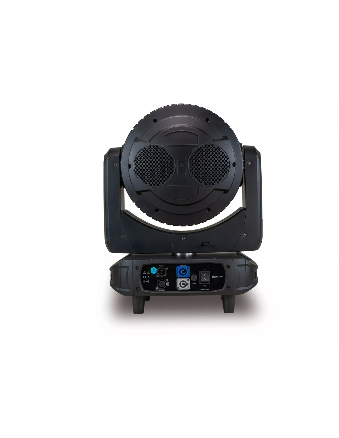 En movimiento, ofrece PAN de 540º y TILT de 270º con resolución de 16 bits, favoreciendo transiciones suaves y posicionamiento preciso. La unidad incorpora display LCD a color, controles por menú, dimmer lineal de 0 a 100% y función estrobo, junto con conexiones DMX por XLR de 3 pines y alimentación mediante conectores PowerCON.