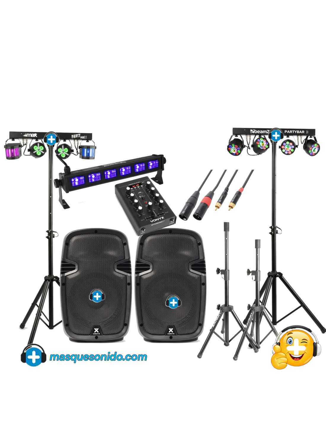 ¿Cuánto espacio necesito para este pack? Este es un pack visualmente grande. Tendrás 2 trípodes para el sonido y 2 trípodes para las luces (PartyBars). Recomendamos tener un espacio frontal de al menos 3 o 4 metros de ancho para desplegar todo el "escenario" y que la fiesta luzca espectacular.