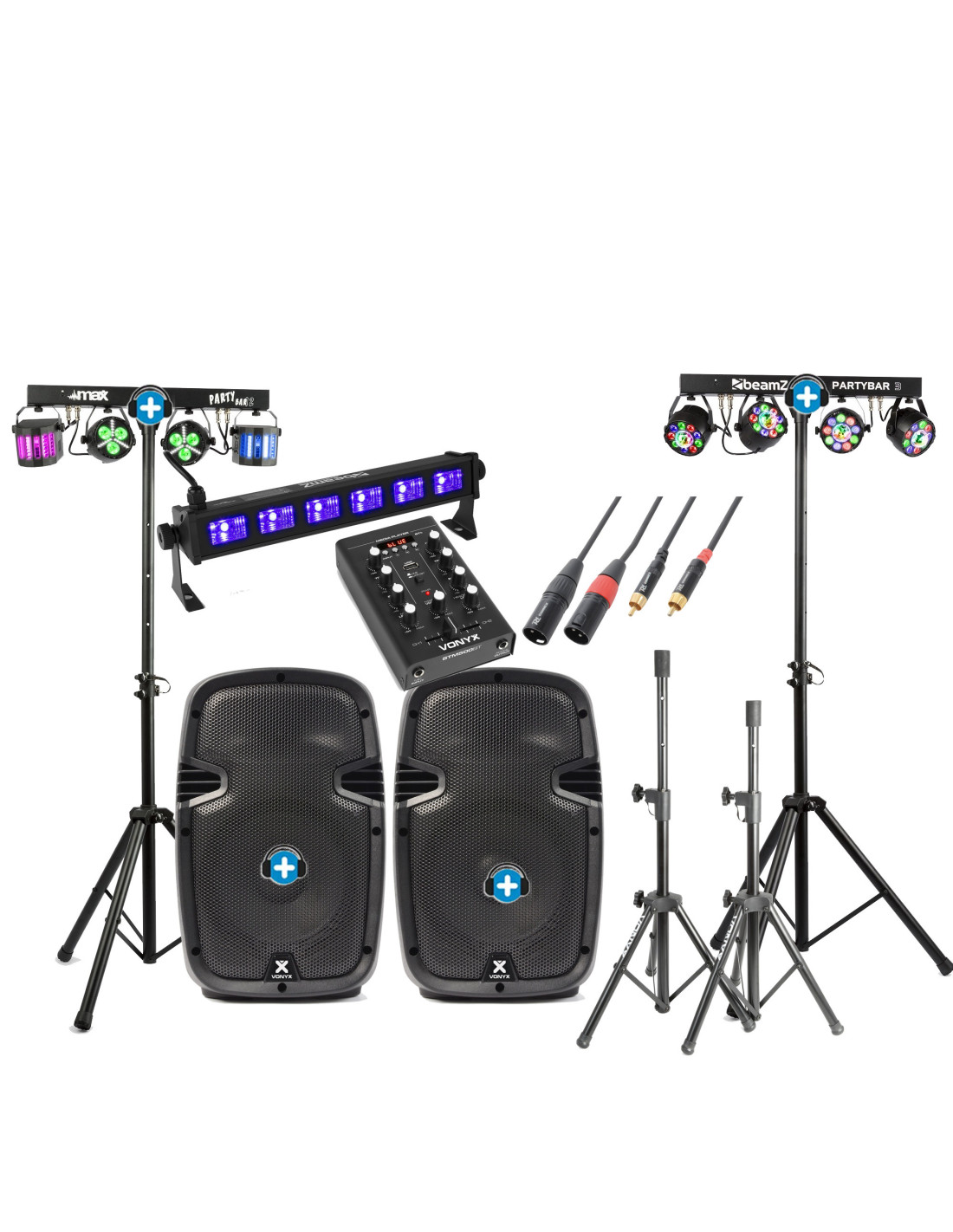 Pack Fiesta Escenario Pro: Altavoces Activos + 2 PartyBars y UV