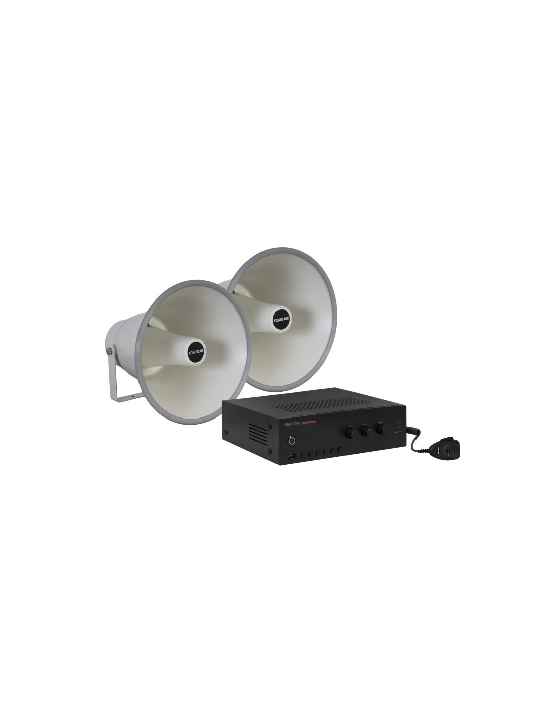 Equipo de megafonía para vehículos Compuesto por: - Amplificador mod. PROX-15 con reproductor USB/FM - Micrófono de comunicaciones mod. MCD-364 - 2 altavoces exponenciales mod. FE-1210 Instalación rápida en vehículos para venta ambulante, publicidad, etc.